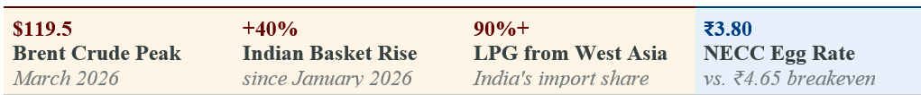 Feed costs, comprising of 67% of layer and 71% of broiler production costs, are the shared vulnerability binding both sectors to Gulf geopolitics. The Indian crude basket jumped 40% between January and March 2026, with diesel cost pressure feeding directly into inter-state maize and soya transport. The medium-term threat is more alarming: India imports ~40% of its total fertiliser from the Gulf. With LNG to fertiliser plants running at ~70% of actual need, major urea producers, including IFFCO, have suspended operations. A fertiliser shortage heading into the Kharif season, accounting for 55% of India’s crop output, could structurally reduce maize and soybean production in 2026-27, locking in elevated feed costs well after any military resolution of the conflict.